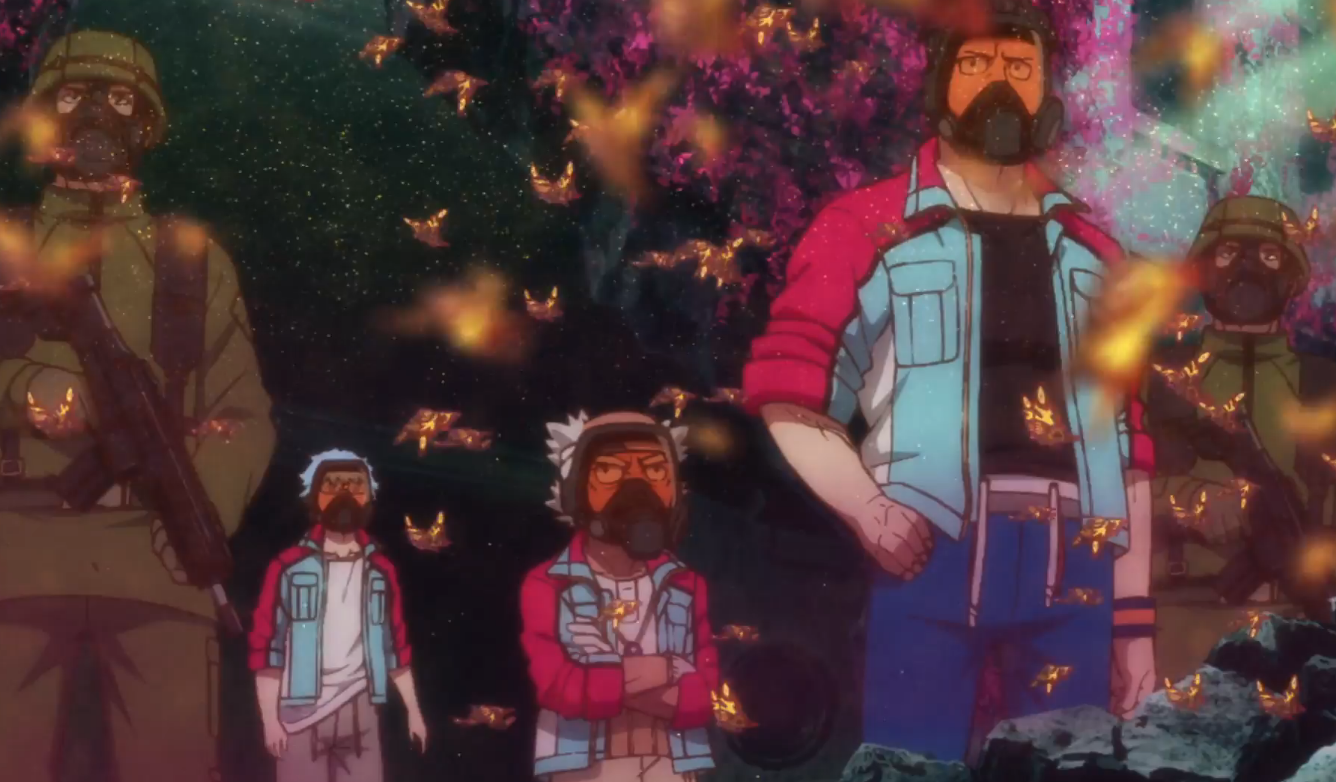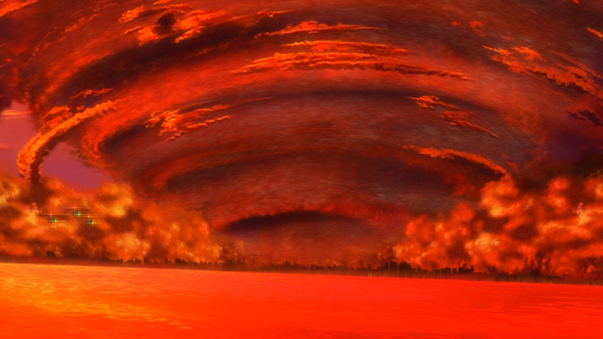 Otaki Factory works to attach a flight pack to Jet Jaguar. As they do so, more of the moths appear. Goro identifies them as silk moths, though their color is wrong. He utters a quotation—"The flight of the yellow butterfly is a sign of warfare"—before he, Yun, Haberu, Yushiyasu, and three trucks of soldiers set out for Godzilla. Deep within the plume of Red Dust, the monster roars.