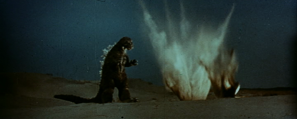 The missiles explode around Godzilla